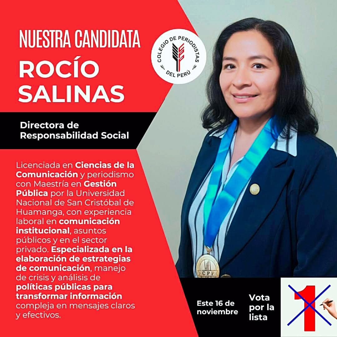 Natural de Ayacucho y con experiencia de vida en California, Rocío Salinas encarna la historia de miles de peruanos que, con esfuerzo, han construido un futuro fuera de su tierra natal. Comunicadora social y periodista de profesión, cuenta con una maestría en Gestión Pública y una trayectoria vinculada al servicio social, el liderazgo comunitario y la gestión pública. En 2022 se desempeñó como subprefecta de su distrito y actualmente es directora de Responsabilidad Social del Colegio de Periodistas del Perú en Ayacucho.