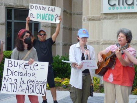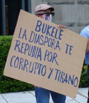 Con cánticos de “Bukele fascista, vos sos el terrorista”, entre otros estribillos, representantes de la Red Mundial Salvadoreña en Defensa de la Democracia (REMUSADE) se manifestaron la tarde de este miércoles 1 de junio frente a la Embajada de su país en Washington, D.C.