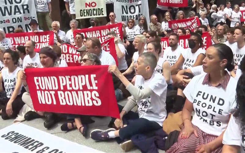 En la ciudad de Nueva York, casi 100 manifestantes contra la guerra liderados por la organización Voz Judía por la Paz fueron arrestados el lunes frente a las oficinas de los senadores demócratas Chuck Schumer y Kirsten Gillibrand cuando intentaban organizar una sentada. Los manifestantes exigían que los senadores usaran su influencia para bloquear una venta pendiente de miles de bombas estadounidenses a Israel.