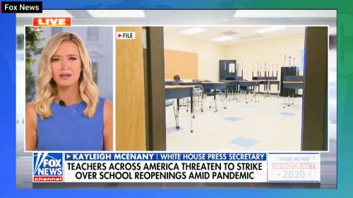 La secretaria de Prensa Kayleigh McEnany sostuvo: “Creemos que los maestros son trabajadores esenciales. Los medios de comunicación nunca dejaron de funcionar durante esta pandemia. Nuestras plantas empacadoras de carne no dejaron de funcionar durante esta pandemia. Nuestras fuerzas del orden no dejaron de funcionar durante esta pandemia. Tampoco deberían hacerlo nuestros maestros, porque los niños estadounidenses deben ser nuestra prioridad”.
