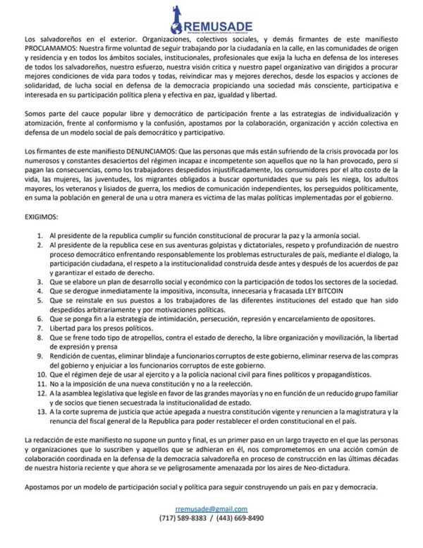 La Red Mundial Salvadoreña en Defensa de la Democracia (REMUSADE) junto a nacionales de ese país, organizaciones solidarias y amigos residentes en la región metropolitana de Washington participarán este jueves 30 de septiembre a las 4pm. en una marcha frente a la Embajada de El Salvador ante la Casa Blanca, ubicada en el 1400 de la calle 16 en el noroeste de Washington, D.C.