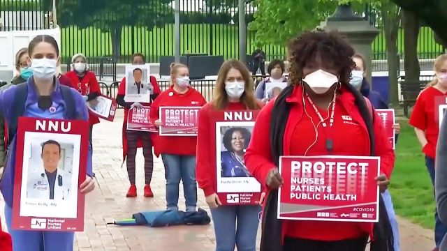 La protesta fue organizada por la organización sindical National Nurses United, que demanda que la Administración de Seguridad y Salud Ocupacional exija que los empleadores proporcionen equipos de protección personal adecuados para los trabajadores de la salud.