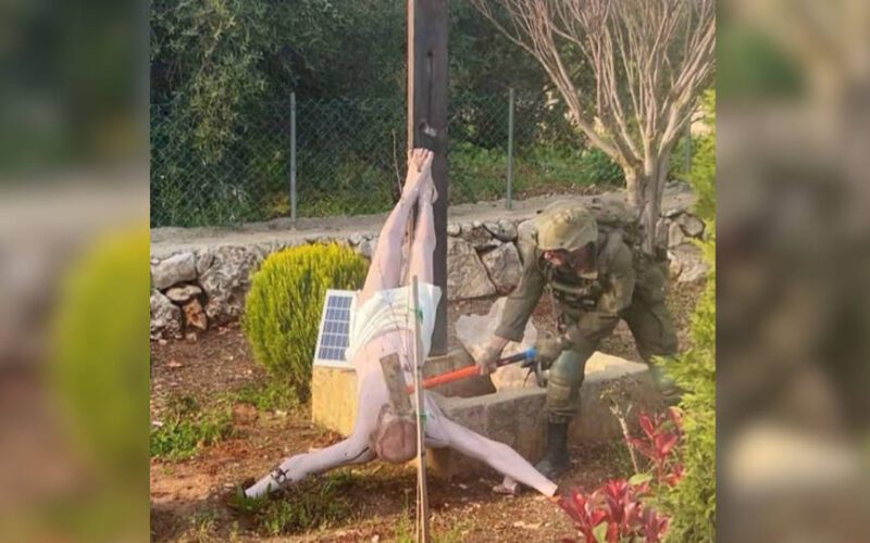 Mientras tanto, una imagen ampliamente difundida en redes sociales muestra a un soldado israelí usando un mazo para romper una estatua de Jesús crucificado en el sur del Líbano ocupado, lo que generó una condena generalizada.