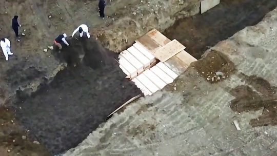 En la isla Hart, en el distrito del Bronx, trabajadores con trajes de protección contra materiales peligrosos entierran cada día en fosas comunes los cadáveres de decenas de víctimas del coronavirus que no fueron reclamados.